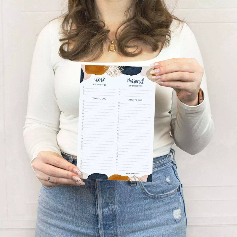 - Space to track top 3 priorities plus 23 to-do items in both your work and your personal life