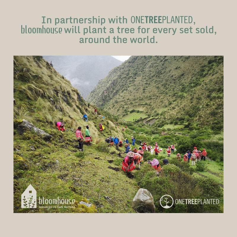 - ONE TREE PLANTED PER SET SOLD: In partnership with One Tree Planted, bloomhouse will also plant a tree around the world for every piece sold in an effort to keep our planet healthy and thriving and encourage acts of kindness and moments of growth.