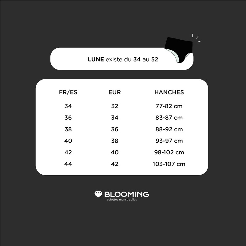 - The plus of the Lune model: the absorbent protection is super covering at the front, back and crotch. It runs from the waist to the buttocks. It contains 2 absorbent layers. Of course, the comfort is retained. No feeling of grandma pants. From 12 years to size 52.