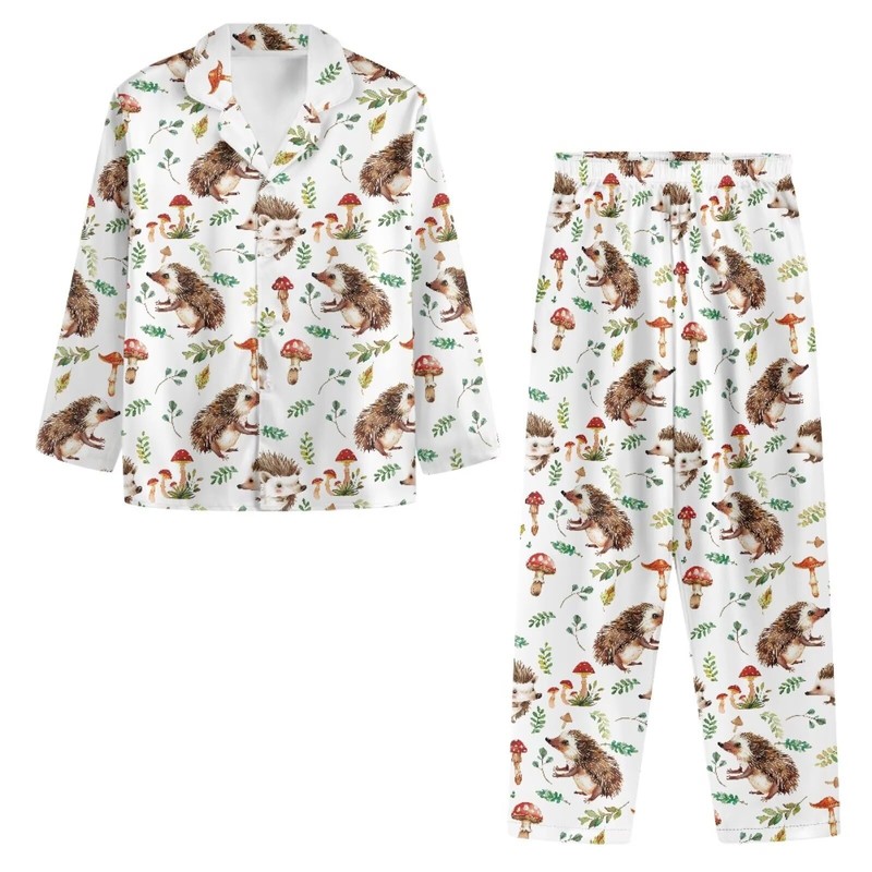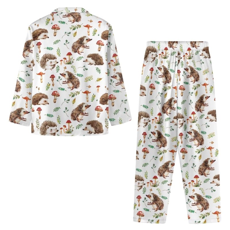 Bloomprint Hedgehog Mushroom Cute Animal Print Pajama Sets For Women Lounge Set Soft Button Down Sleepwear Long Sleeve Nightwear