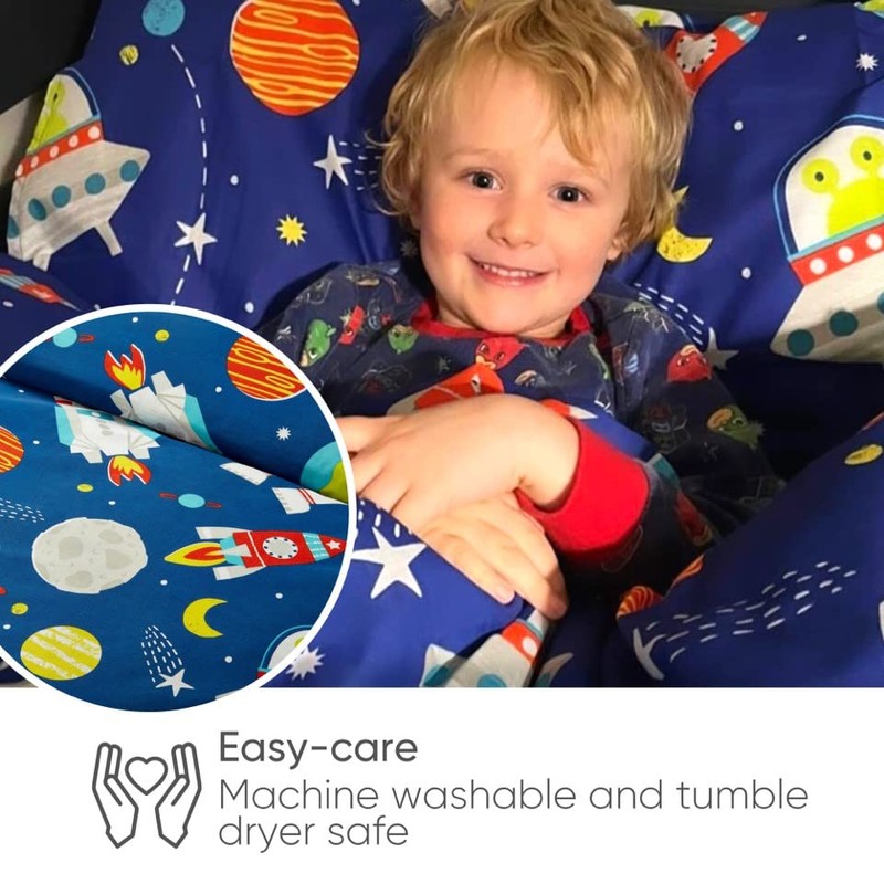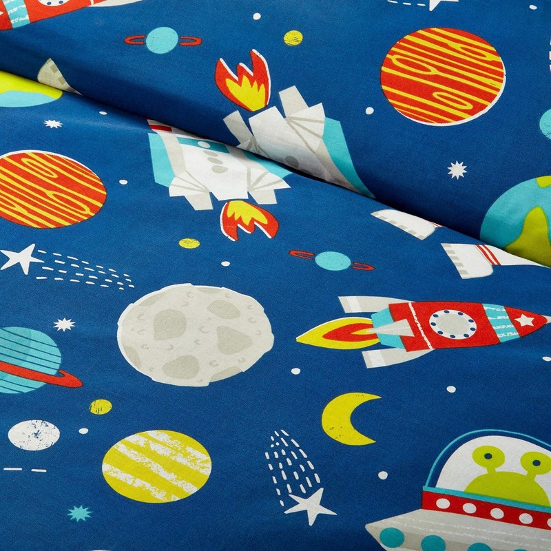 - Fun, playful design: with this printed bedding set, you can bring space into your child's room. The design with colourful planets, rockets, UFOs and more is perfect for engaging your little one's imagination and bringing them closer to the wonders of the solar system.