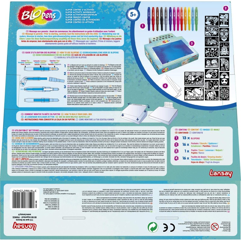 - The set includes: 13 blopens, 16 stencils, 16 sheets of drawing paper, a box with painting desk