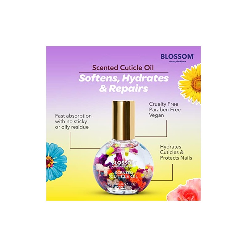 - Blossom cuticle oil softens, hydrates and repairs cuticles.