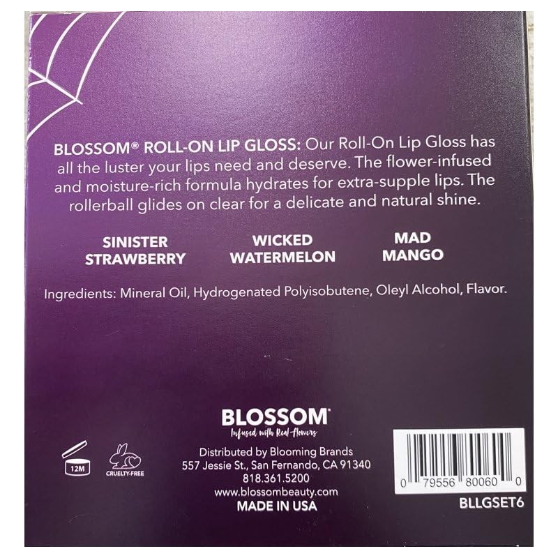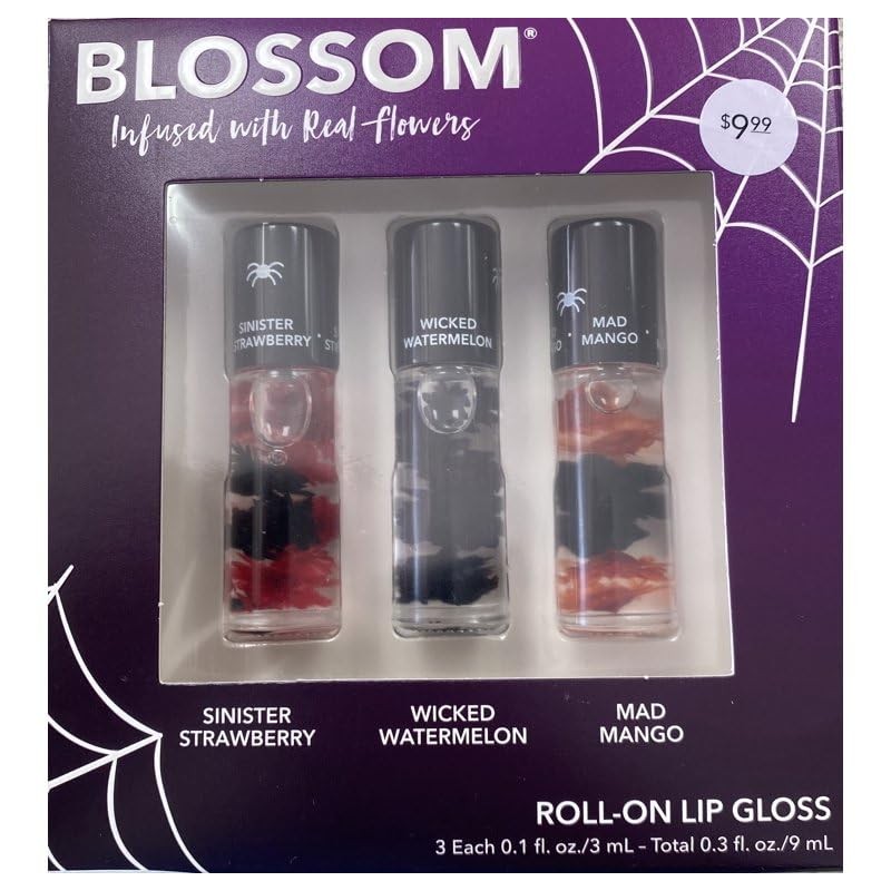 Blossom Scented Roll on Lip Gloss, Infused with Real Flowers, Made in USA, 0.3 fl. oz./9ml, 3 pack Mini Gift Set, Sinister Strawberry/Wicked Watermelon/Mad Mango