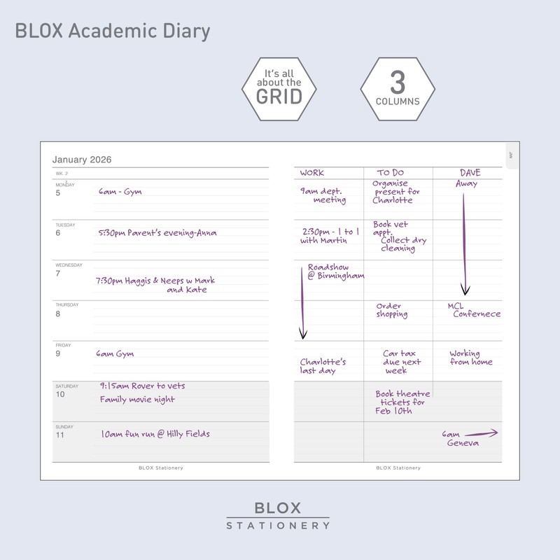 - This diary is all about the Week-To-View with our 3 column GRID layout, with a page for appointments etc and columns on the opposite page for projects, exercise tracker, meal plans, lists, deadlines, however you organise your life. Suitable for STUDENTS, TEACHERS, SHIFT WORKERS and anyone who organises their life based on the ACADEMIC MID-YEAR CALENDAR.