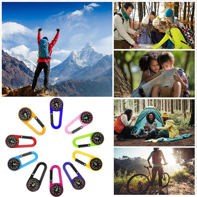 - 3 IN 1 DESIGN Our mountaineering carabiner features a compass, Velcro closure and keychain. Ideal for hanging water bottles, keys or binoculars, this mini compass is perfect for all weather and survival in the wild.