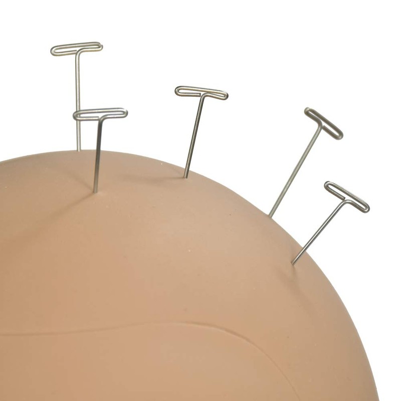 A2: This bald training Head made by brand new and high quality soft PVC, soft skin feel, not hard plastic. The interior filler material is professional polyurethane foam. T-pins can be used.
