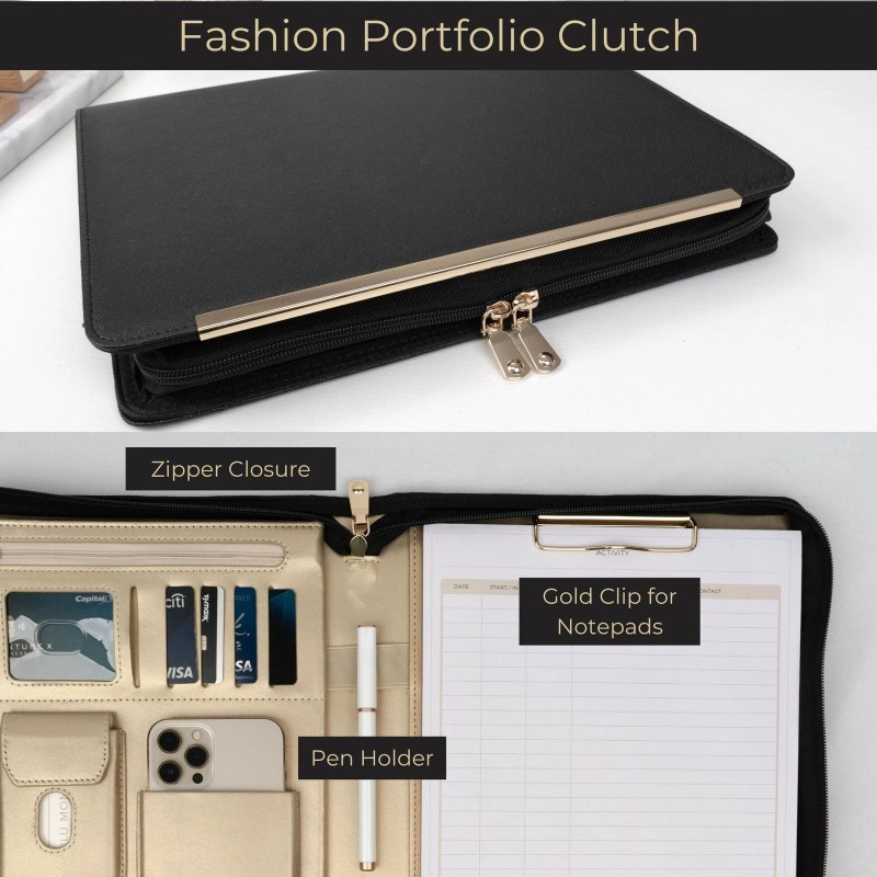 Premium Black Leather Finish with Gold Accents - Stylish and durable leather portfolio for women with gold trim for an elegant touch.