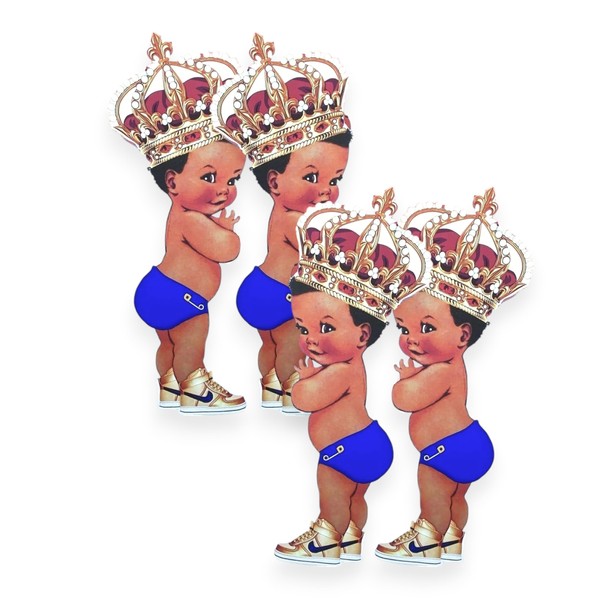 Blue African American Baby Boy Cutouts – Gold Red Crown Diaper Decorations for Baby Shower or 1st Birthday Party, One-Sided Print, Royal Prince Theme Table Décor (16 inches - 4 pcs)