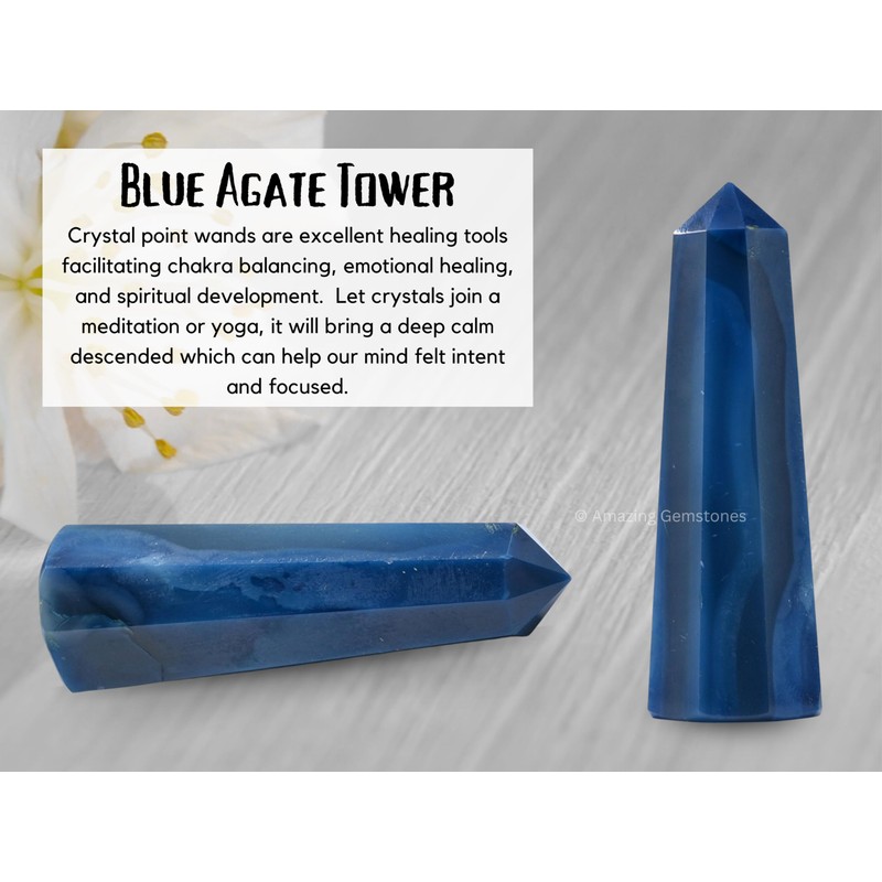 - Blue Agate Crystal Tower will uplift and purify the energy (if its point is not damaged), so you can place it in any area that needs to be re-energized with strong energy. Length of this tower / wand / obelisk / point is 2" inch to 3" inch (5cm to 7.5cm) & width is 0.75 inch (2 cm).