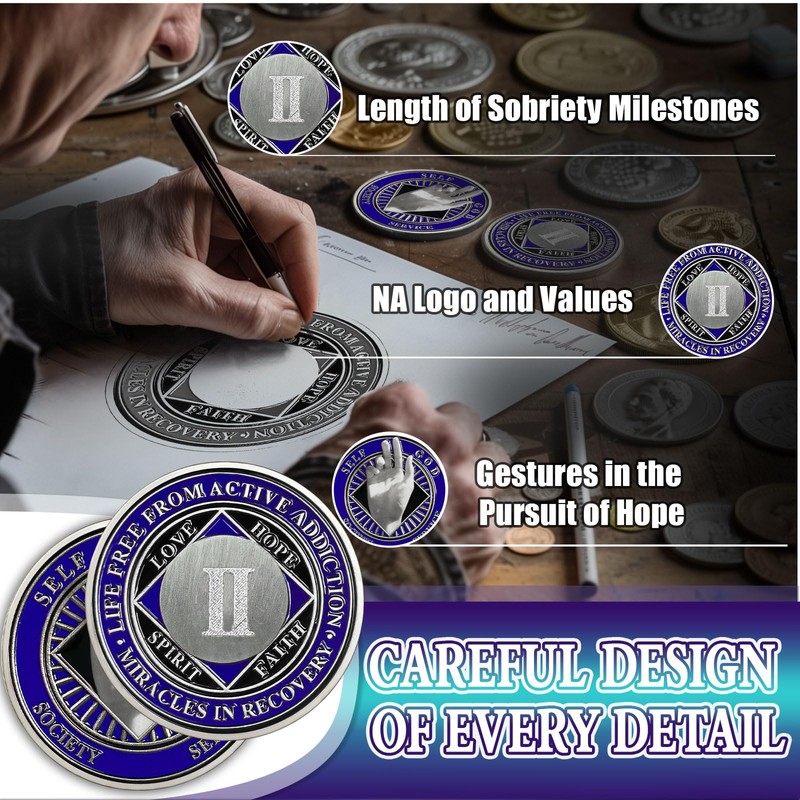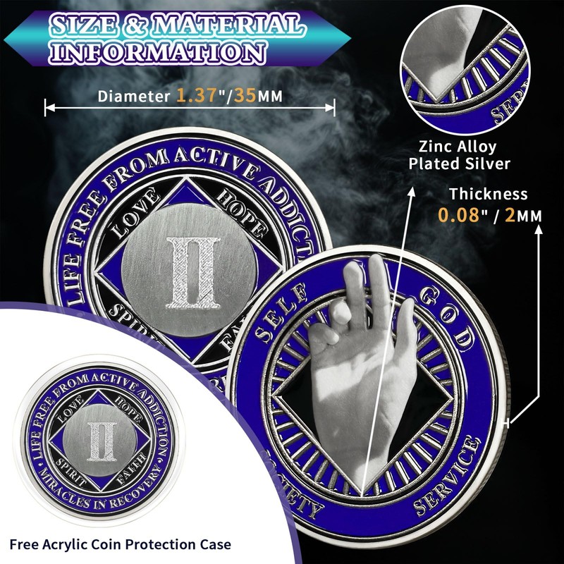 - Exquisite Front Design: The NA coin has a Roman numeral “Ⅱ” in the center of the front representing one year of recovery, and “LOVE, HOPE, FAITH, SPIRIT” is written on the edge of the NA rhombus, which are the core values to be maintained in the process of recovering from drug addiction. The sobriety coin is engraved with “LIFE FREE FROM ACTIVE ADDICTION” and “MIRACLES IN RECOVERY”, which means that we have to get rid of the drug addiction and go to have freedom and make a miracle