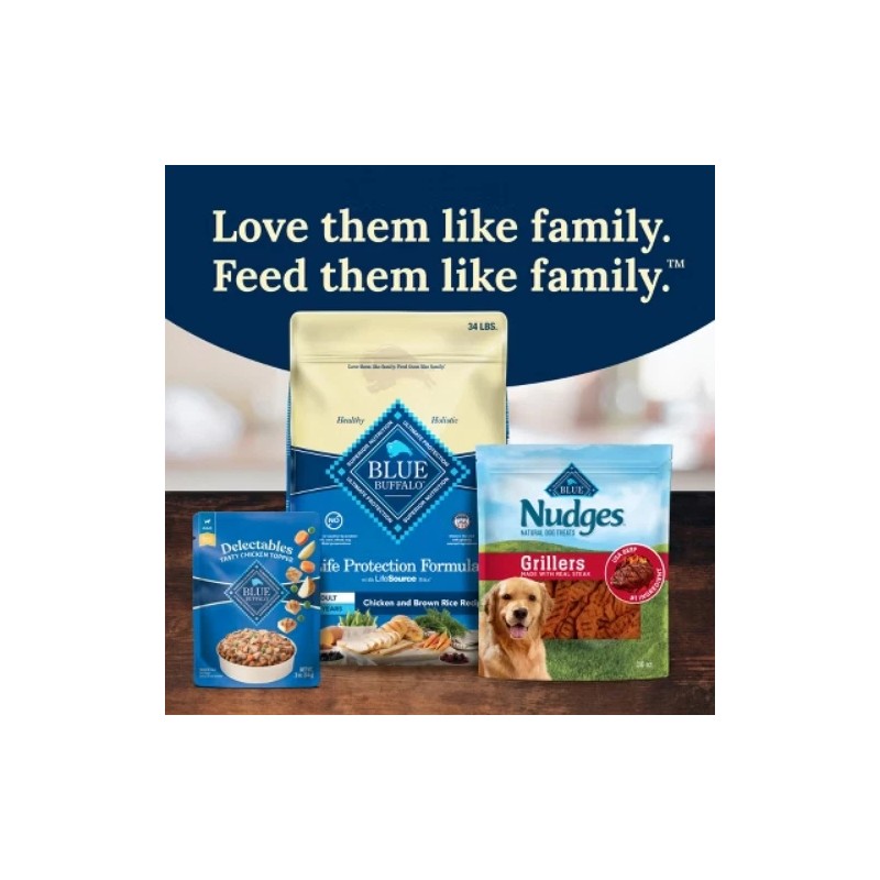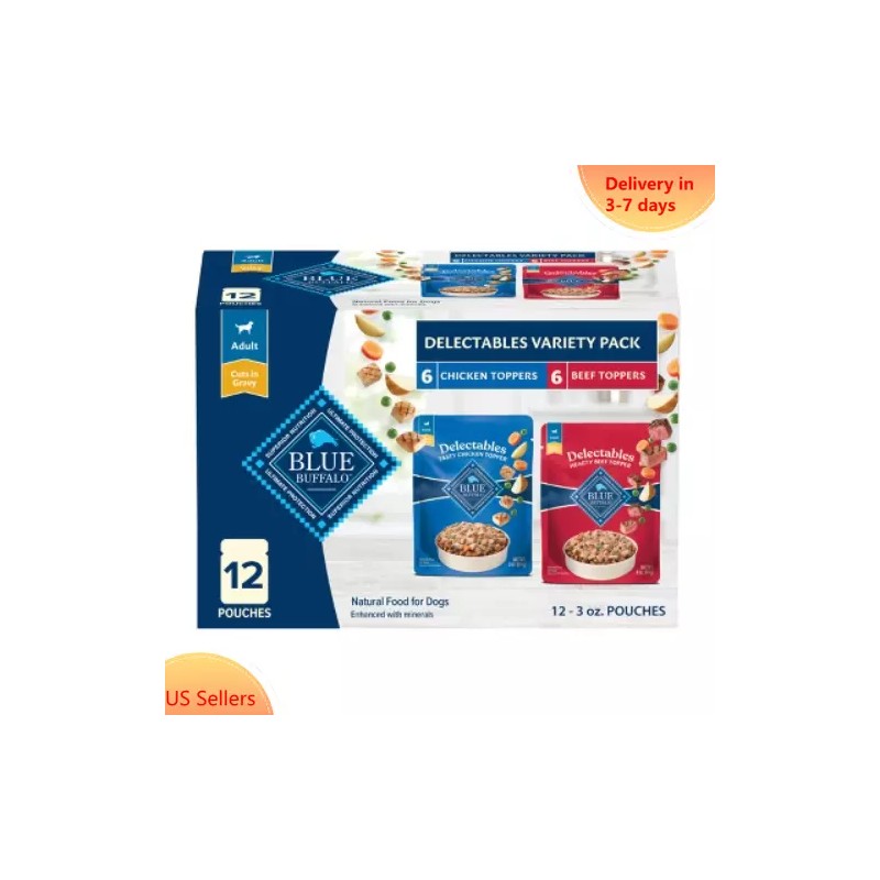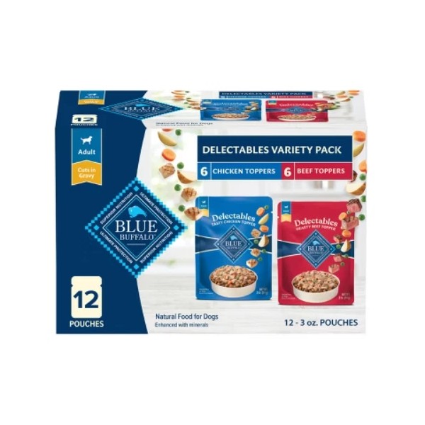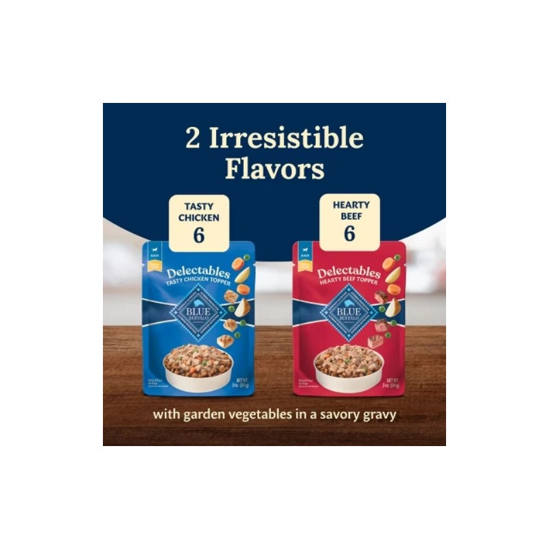 Make mealtime extra special with BLUE Delectables natural wet dog food toppers. This dog food variety pack features two irresistible flavors: Tasty Chicken and Hearty Beef. Featuring tender cuts of real chicken or beef with garden vegetables in gravy, these grain-free dog food recipes come in single-serve pouches that are easy to open and perfectly portioned. And like all Blue Buffalo dog food recipes, BLUE Delectables are formulated with no chicken (or poultry) by-product meals, no corn, wheat, or soy, and no artificial flavors or preservatives. Serve BLUE Delectables as a delicious topper over dry food or as a tasty treat between meals.