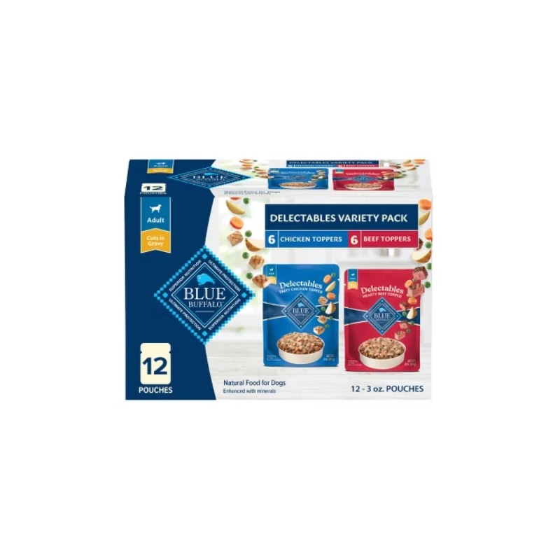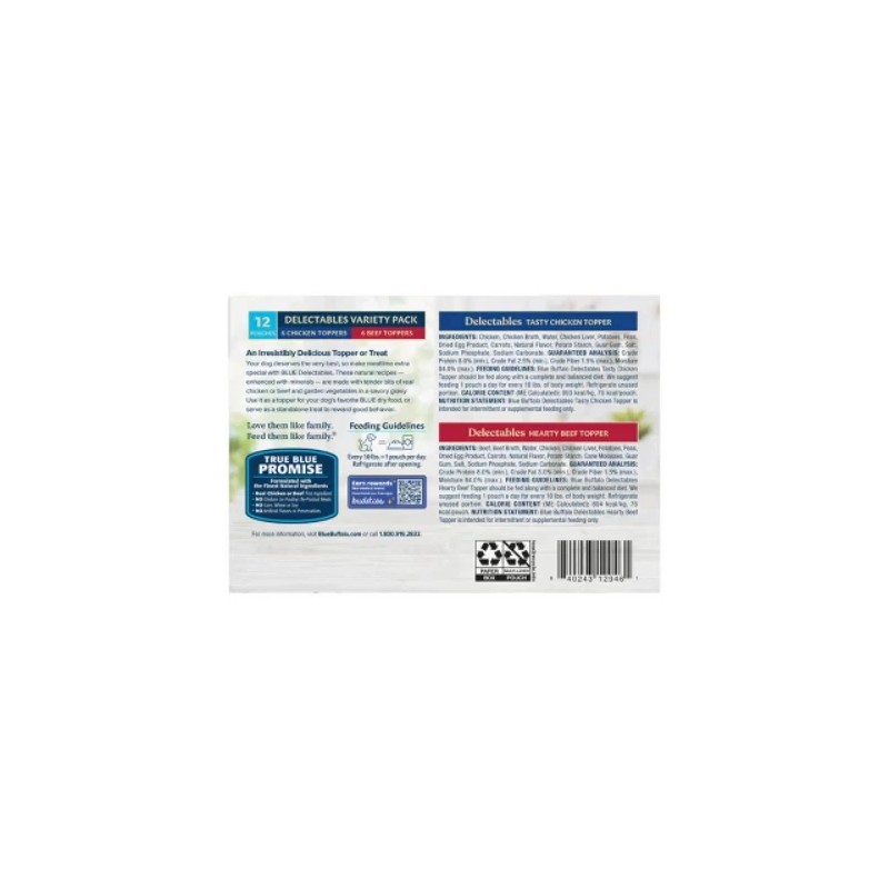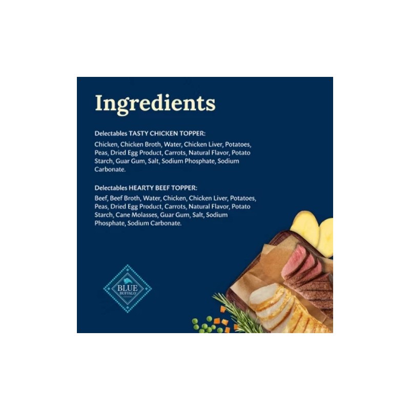 Contains: Six (6) pouches of BLUE Delectables Tasty Chicken Cuts in Gravy and six (6) pouches of BLUE Delectables Hearty Beef Cuts in Gravy (12 pouches total)