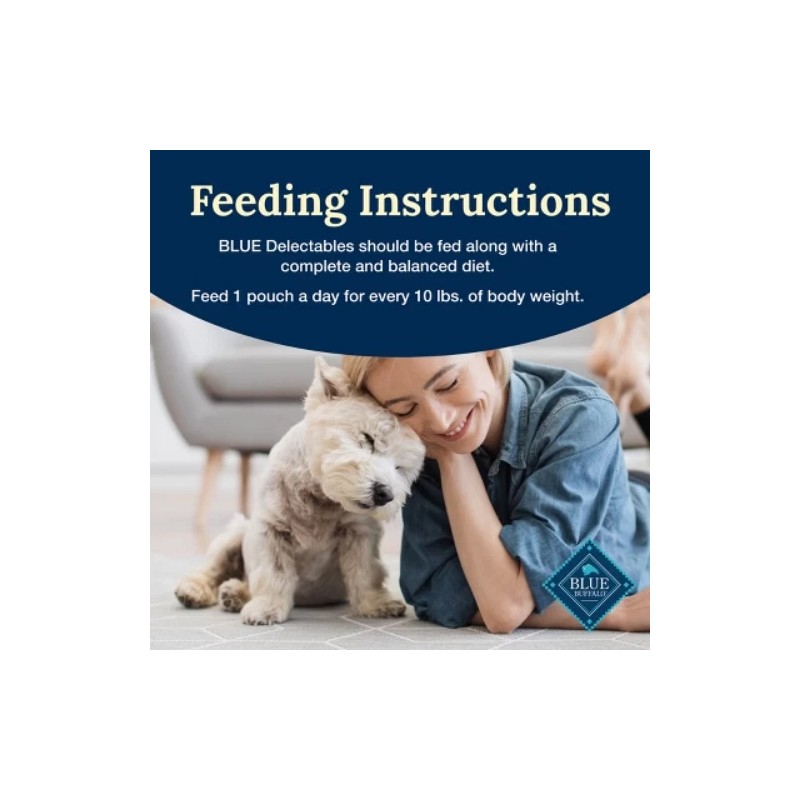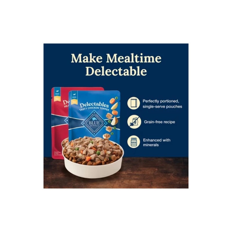 SINGLE-SERVE POUCHES: BLUE Delectables dog food toppers are perfectly portioned for easy serving