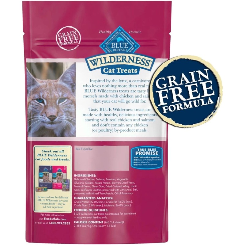 BLUE Wilderness cat treats are: 100% grain-free, Made with real chicken and salmon. Free from chicken, poultry by-product meals, artificial flavors and preservatives
