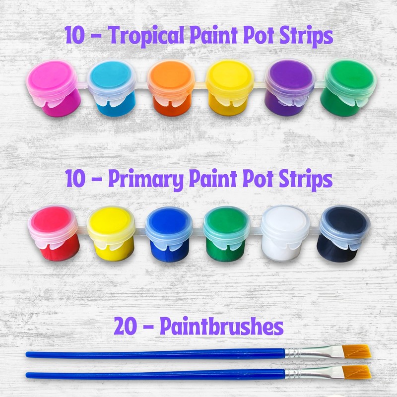 - 20 High Quality, Bright and Vivid Acrylic Paint Pot Strips in 5ml Jars with 20 Paint Brushes. Great For Kids, Our Paint Pots are Non-Toxic, Water-Based, Acid-Free and Conform to ASTM D4236 and EN71.