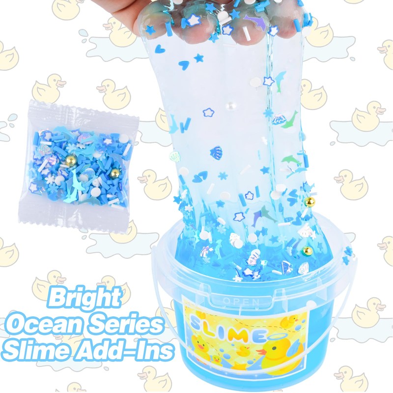 - BLUE CRYSTAL SLIME: Clear slime mixed with sparkling shells, pearls and baby dolphin decorations, the three ducklings seemed to swim freely in the blue sea. It's the kids' favorite crystal slime(300ml)