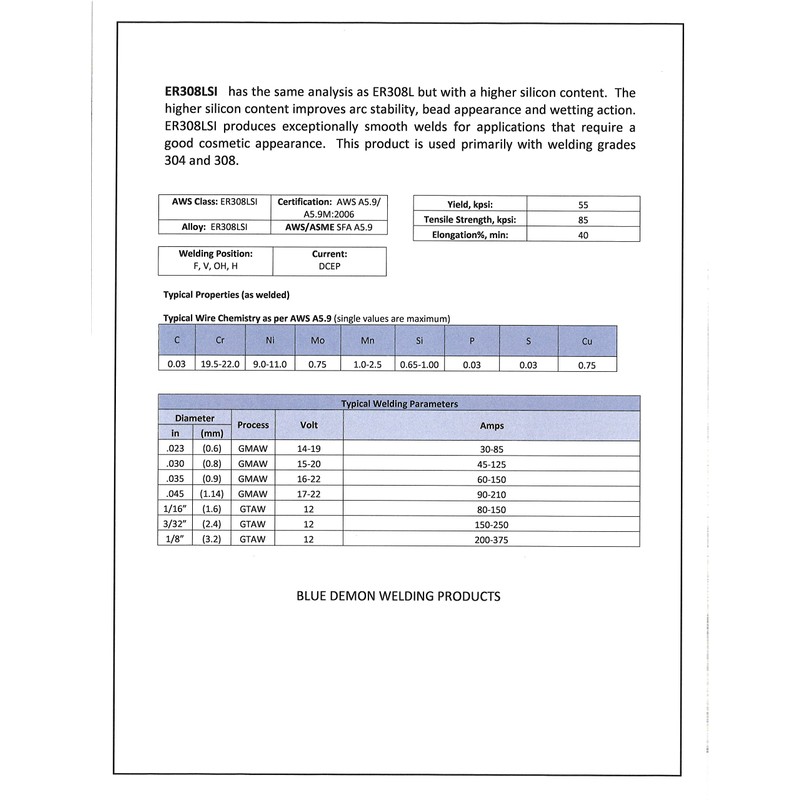 - ER308LSI produces exceptionally smooth welds for applications that require a good cosmetic appearance