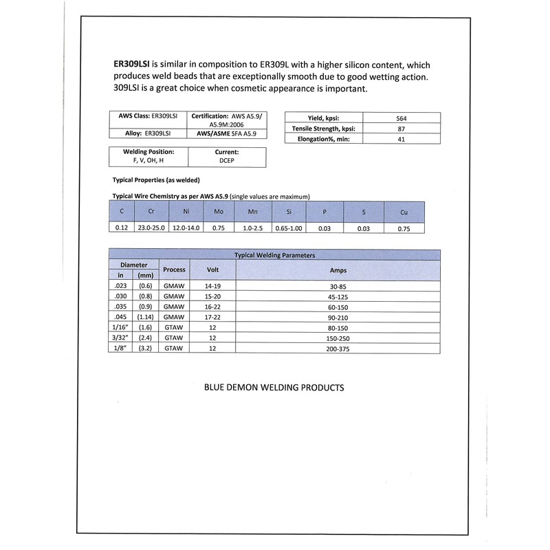 ER309LSI is similar in composition to ER309L with a higher silicon content, which produces weld beads that are exceptionally smooth due to good wetting action.