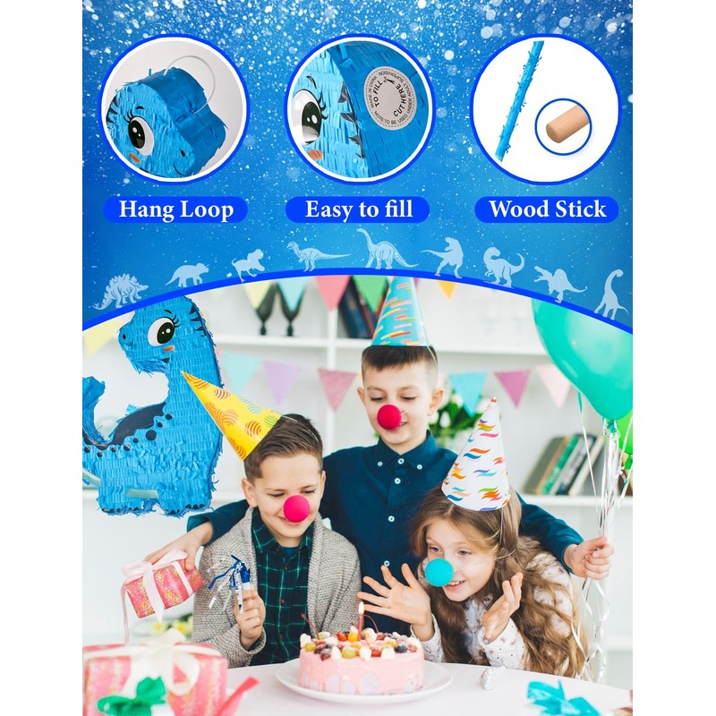 Blue Dinosaur Piñata for Boys,Piñata de Dinosaurio para niños with 12pcs Paper Glasses, Wood Stick, Confetti, and Blindfold,Dino Piñata for Birthday Party Decorations(16"*12.6"*3.5")
