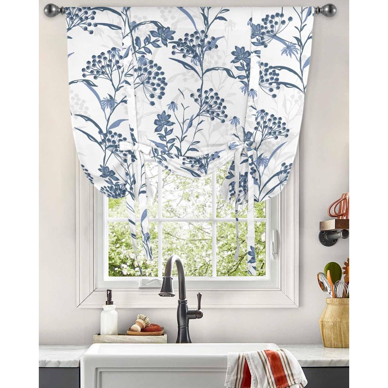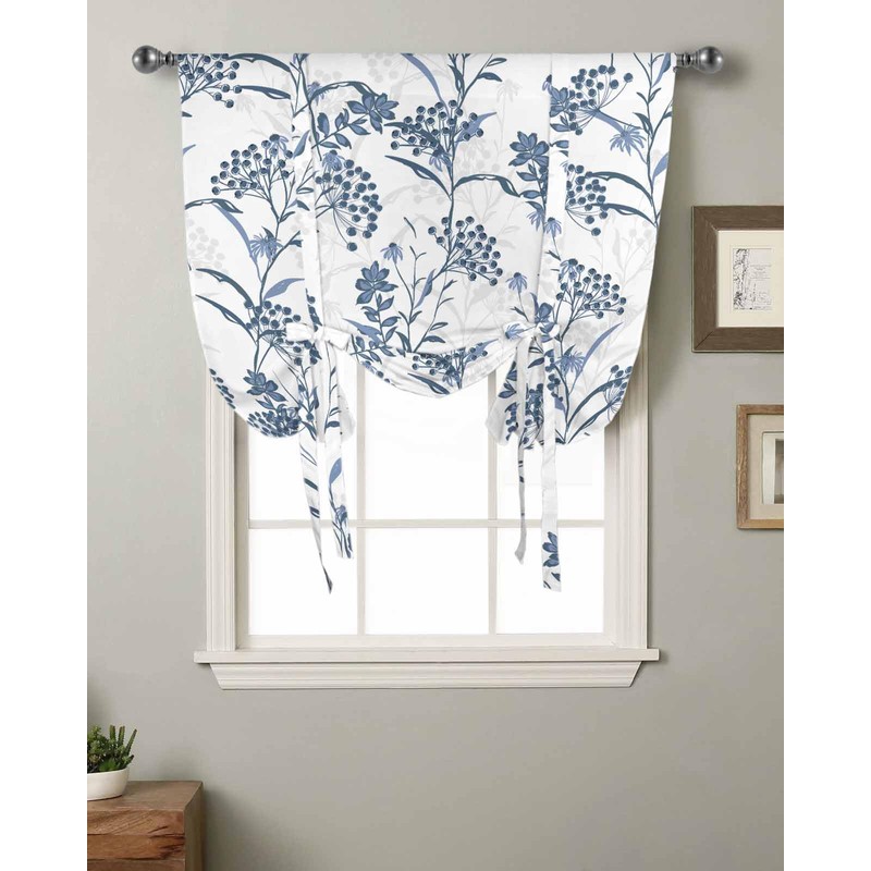 Blue Floral Plant Tie Up Curtains for Kitchen Bedroom Living Room Windows, Adjustable Tie-Up Shade Rod Pocket Curtain Valance Drape Grey Modern Minimalist White Floral Spring Summer 1 Panel, 52" x 45"