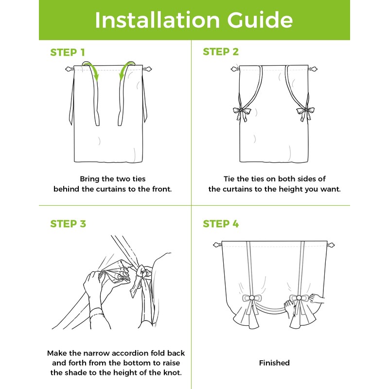 - Premium Fabric: This tie up shade is made of high quality polyester fabric and fine stitching workmanship, soft and durable. The tie-up curtain panel material is green and environmentally friendly, and is safe and healthy for children and the elderly. The effect of the bow tie makes the bathroom curtain more beautiful, and meets the practical and beautiful needs of most families for rod pocket curtains.