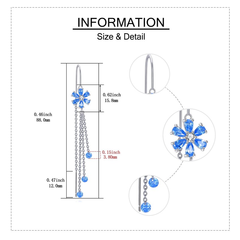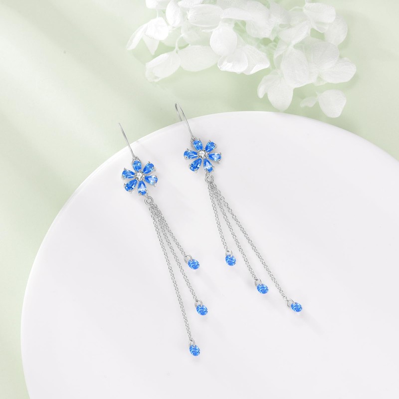 Blue Flower Threader Earrings Sterling Silver Long Tassel Drop Dangle Earrings Jewelry Gift for Women