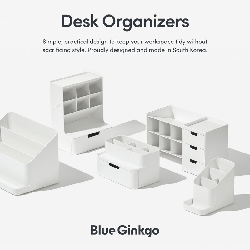 "Declutter Your Space, Elevate Your Day Stay organized in style with the Blue Ginkgo Desk Organizer Collection—thoughtfully designed to bring calm and order to any workspace, vanity, or dorm. Whether you’re sorting stationery, makeup brushes, tech accessories, or school supplies, our compact organizers help maximize every inch without sacrificing aesthetics. Choose Your Perfect Fit: Compact Organizer (5 Compartments + Half Drawer) Ideal for smaller desks or vanities. Four deep compartments and a shallow tray keep pens, brushes, or cables tidy, while a smooth-glide half drawer stores smaller essentials out of sight. Portable Organizer (3 Compartments + Half Drawer) Lightweight and sleek with a modern silhouette. Designed for versatility—from desktop to nightstand—and features the same smart layout for easy daily access. Hive Organizer (6 Compartments + Full Drawer) Go vertical for even more storage. Six sloped compartments provide high visibility, a raised tray holds loose items, and the full-width drawer hides clutter for a cleaner workspace. All three styles are designed and made in South Korea. Clean lines, soft white tones, and minimal branding ensure they fit beautifully in home offices, classrooms, dorms, or creative spaces. Founded in 2020 in Seoul, Korea, Blue Ginkgo is a family-owned company creating practical, stylish products that simplify routines and bring the best of Korean design to your everyday life."