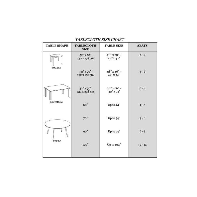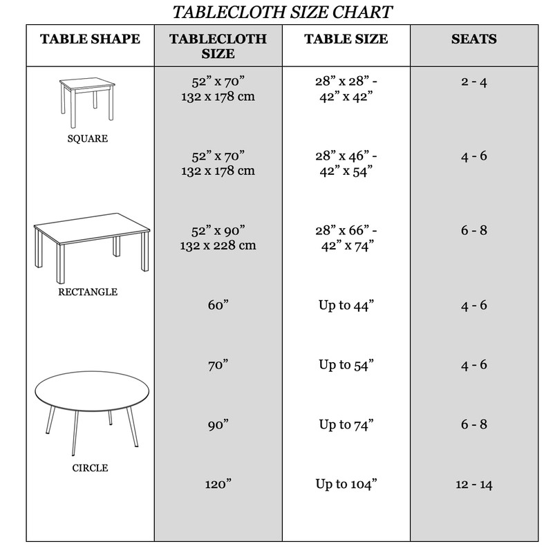 - [VARIETY OF CHOICES] These tablecloths are available in many different colors and sizes. Use our sizing chart to find the right fit for your table and pick a color that suits you best! Each packaging includes a single tablecloth sewn to perfection. Please make sure to measure your table before purchasing.