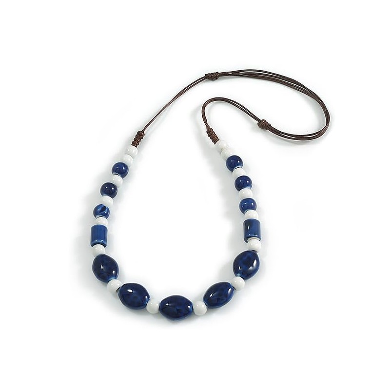 Blue Oval and White Round Ceramic Bead with Brown Silk Cords Necklace/50cm L Minimum/Adjustable/Slight Variation In Colour/Natural Irregularities