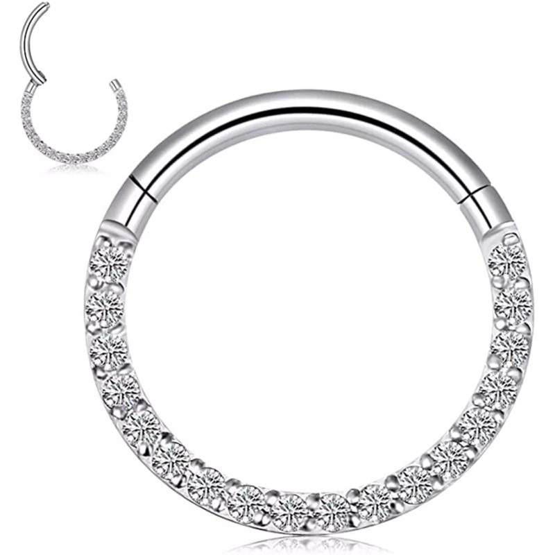 - Add some sparkle and charm to your septum piercing with this gorgeous septum ring. CZ gemstone that displays a dazzling play-of-color on the outer edge of a circular ring. The ring is made of surgical steel and has a hinged design that makes it easy to insert and remove. The ring size is 16 gauge and 5/16 inch. it can also be used for other piercings such as cartilage, helix or tragus This jewelry is a must-have for opal lovers or anyone who wants to enhance look with a touch of elegance.