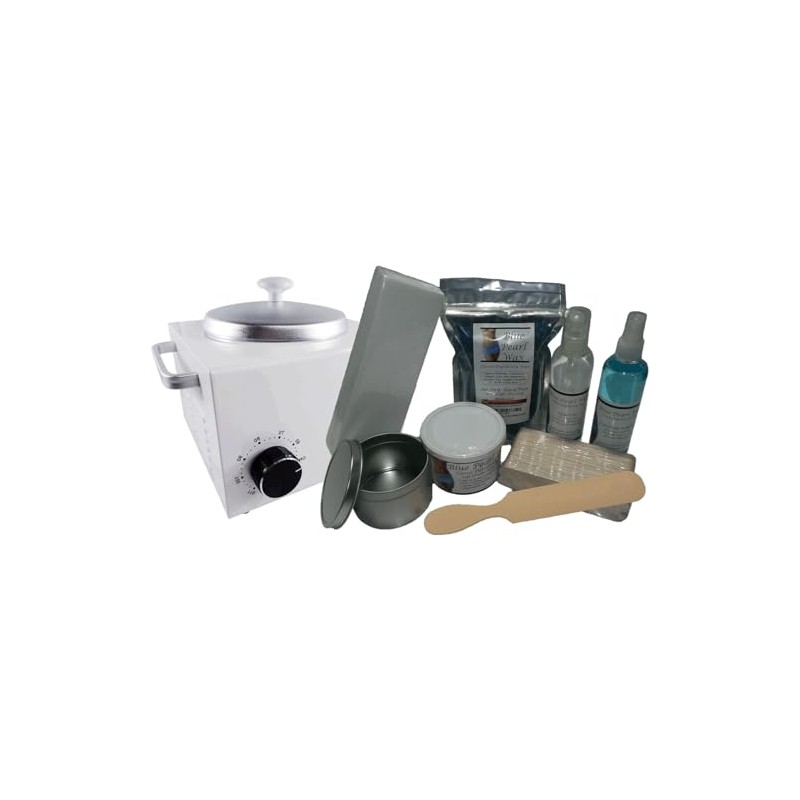 - This kit includes: Qty 1 Single Wax Pot Qty 1 Blue Pearl Wax Ocean Tide Bead Hard Wax (Stripless) Small Bag Qty 1 Blue Pearl Wax Crystal Lagoon Soft Wax (Strip) 400g (14 oz) Can Qty 1 Blue Pearl Wax Tahitian Solution Pre Wax Solution 250 ml (8oz) Qty 1 Blue Pearl Wax Opal Oil Post Wax Solution 250 ml (8oz) Qty 1 Large Wide Wood Stick 6" x 3/4" Qty 100 Qty 1 Large Hard Plastic Waxing Spatula 9.5" x 1.5" Qty 1 Disposables Non-Woven Strips - 100/Pk Qty 1 Empty Tin with Lid