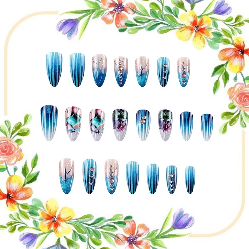 24Pcs Blue Gradient Press on Nails Medium Almond Nails Flower Rhinestones Stripes Design Acrylic Nails Suitable for Women Daily Manicure Decorations