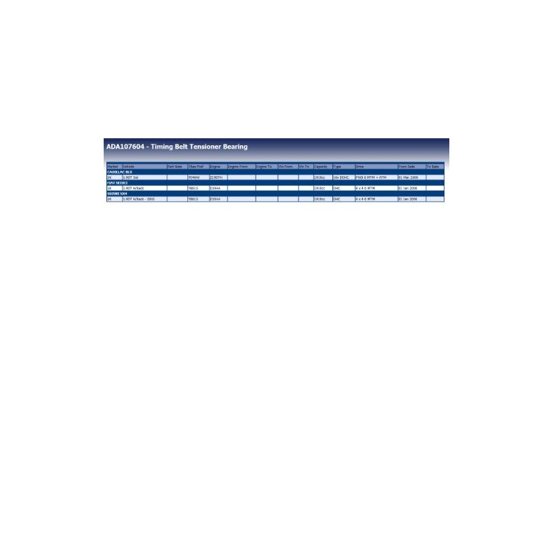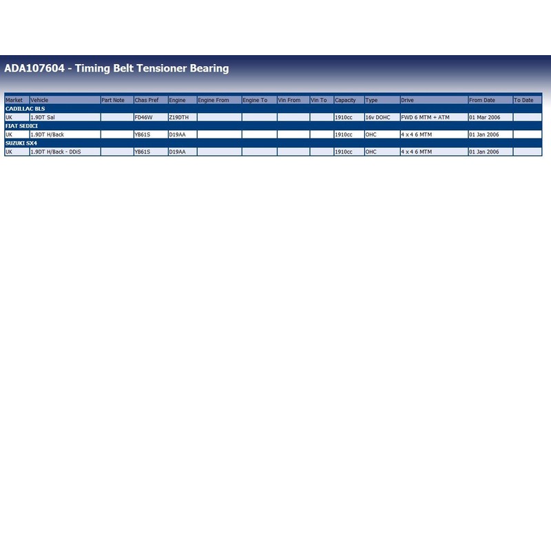 • OE numbers (for comparison purposes only): Alfa Romeo Romeo 55238027; Cadillac 93186866; Chevrolet (GM) 55566028; Chrysler 05142798AA; FIAT 55238027; Jeep 55238027; Lancia 55215666; Opel 0636 685, Suzuki 12810-79J52, Vauxhall 55566028; OEM numbers (for comparison purposes only): GATES T43211, Dayco ATB2547, Continental / Contitech V55844, Ruville 55844, SKF VKM 12174, Ruville 56036, NTN-SNR GT358.30