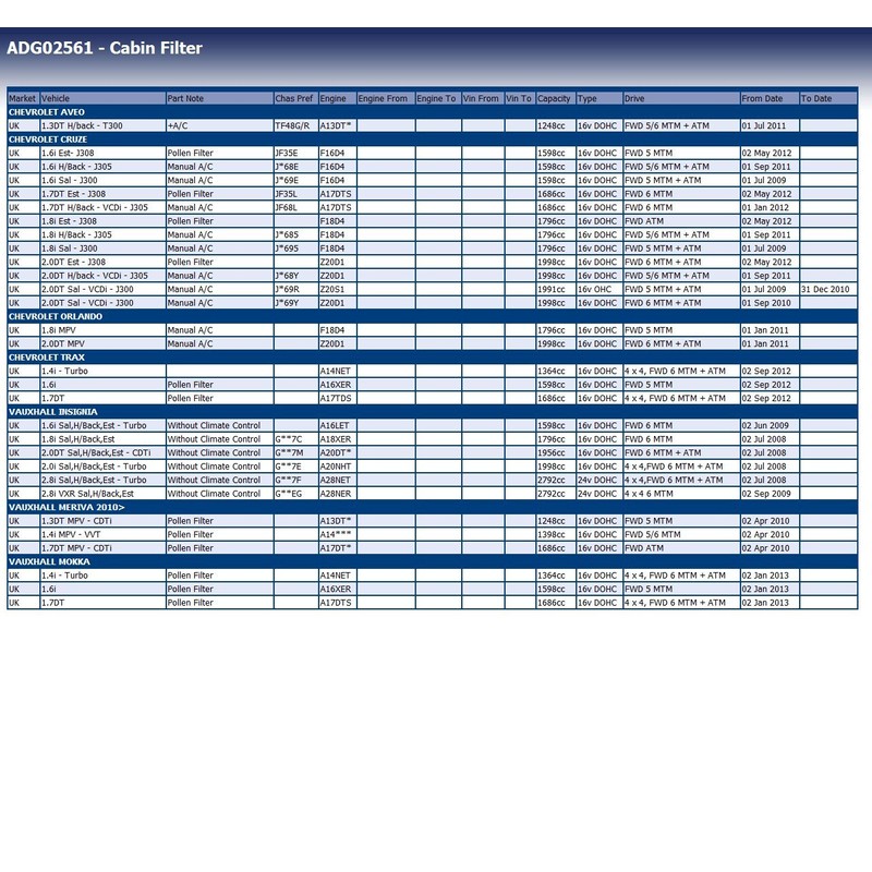 - Suitable for: Chevrolet (GM): Spark, Cruze, Orlando, Aveo, Opel: Mokka, Meriva B, Insignia A, Insignia A Sports Tourer, Cascada, Insignia A Country Tourer