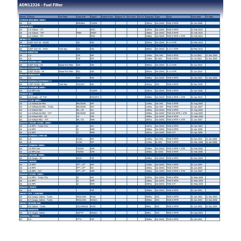 - among others suitable for: Dacia: Duster, Duster 4x4, Logan, Sandero, Super Nova; Renault: Clio II, Clio III, Duster, Duster 4x4, Espace III, Espace IV, Fluence, Grand Espace IV, Grand Modus, Grand Scenic II, Grand Scenic III, Kangoo I, Kangoo I 4x4, Kangoo II, Laguna II, Laguna III, Latitude, Logan I, Megane II, Megane III, Modus, Scenic II, Scenic III, Scenic Xmod III, Symbol I, Symbol II, Thalia I, Thalia II, Trafic II, Twingo I, Twingo II; Citroën: Berlingo I, Berlingo I 4x4, Berlingo II, Berlingo III, C2, C3 I, C3 II, C3 II Pluriel, C3 III, C3 III Picasso, C4 I, C4 I Grand Picasso, C4 I Picasso, C4 II, C4 II Grand Picasso, C4 II Picasso, C5 II, C5 III, C6, C8, DS3, DS4, DS5, DS5 4x4, Dispatch II, Jumpy II, Xsara Picasso; DS: DS3; Peugeot: 0508, 1007, 2008, 206, 206+, 207, 207+, 208, 3008 I, 301, 307 I, 307 II, 308 I, 308 II, 407, 607, 807, Expert I, Partner I, Partner II, Partner III, RCZ, Ranch I, Ranch II; Smart: Cabrio Cabrio (BM 450), City Coupe (BM 450), Crossblade (BM 450), Forfour (BM 453), Fortwo Cabrio (BM 450), Fortwo Coupe (BM 450), Roadster (BM 452), Roadster Coupe (BM 452); Opel: Vivaro A; Infiniti: EX30d 4x4, FX30d 4x4; Nissan: Aprio, Kubistar, Navara III 4WD, Pathfinder III 4WD, Platina, Primastar, Qashqai I, Qashqai+2 I, Terrano III; Vauxhall: Vivaro I