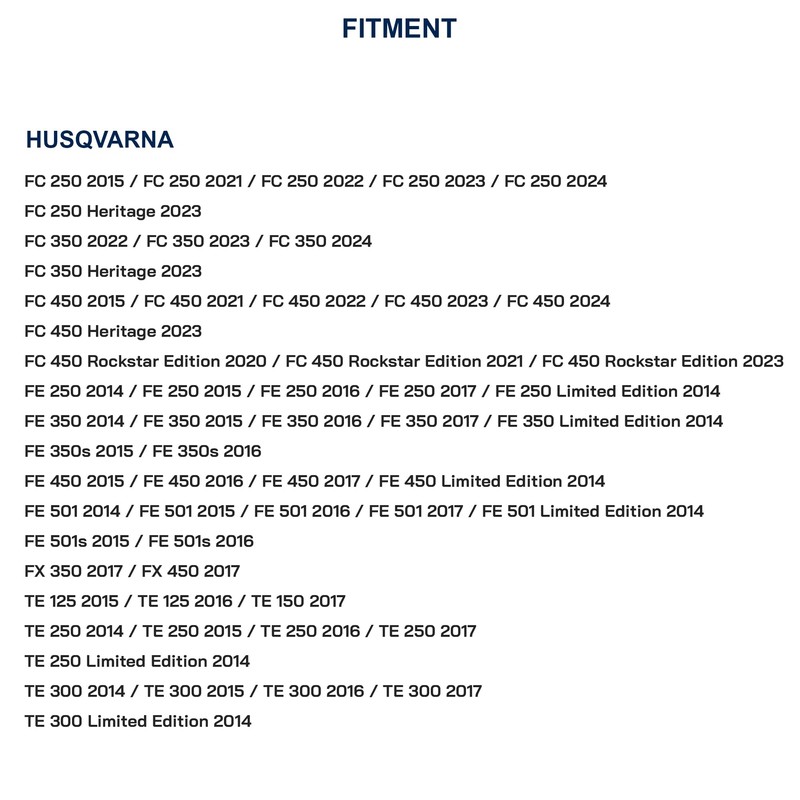 - ☞ Apply to Fitment: Replacement for Husqvarna FC 250 2015 / FC 250 2021 / FC 250 2022 / FC 250 2023 / FC 250 2024 / FC 250 Heritage 2023 / FC 350 2022 / FC 350 2023 / FC 350 2024 / FC 350 Heritage 2023 / FC 450 2015 / FC 450 2021 / FC 450 2022 / FC 450 2023 / FC 450 2024 / FC 450 Heritage 2023 / FC 450 Rockstar Edition 2020 / FC 450 Rockstar Edition 2021 / FC 450 Rockstar Edition 2023