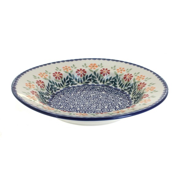 - For less mess, this unique shape is great for soups and pasta. Hand crafted by artists in Poland, each piece is high fired and double glazed for everyday use. 9.25-inch diameter, 1.5 inches deep. Microwave, dishwasher, freezer, and oven safe.