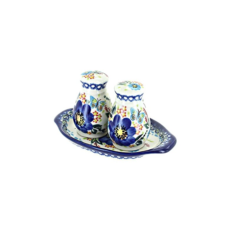 Blue Rose Polish Pottery Garden Of Blue Salt & Pepper Shakers with Tray