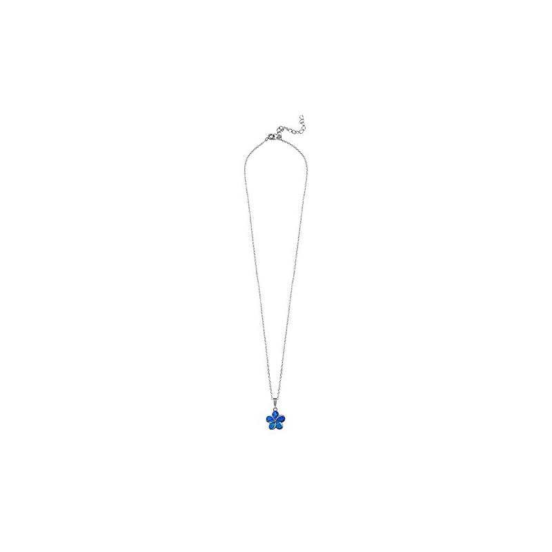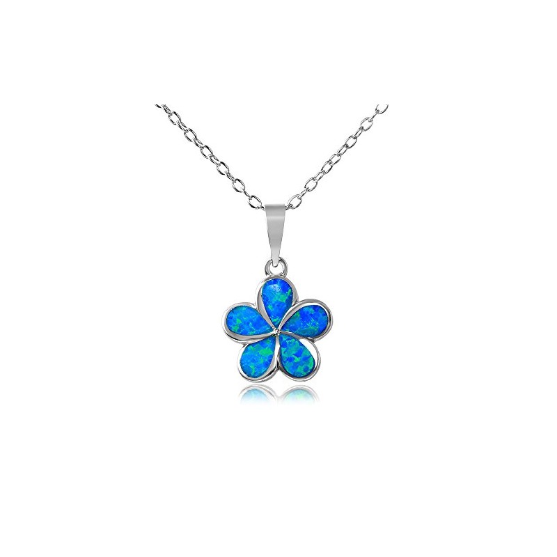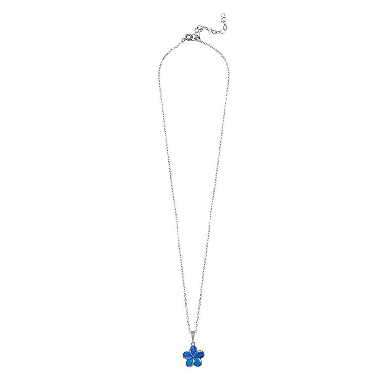 Blue Simulated Opal Stone Hibiscus Flower Necklace Rhodium Plated Sterling Silver