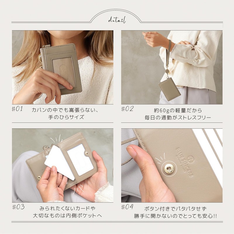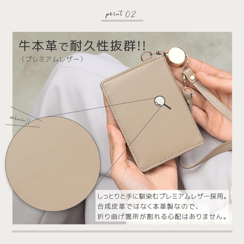 BLUE SINCERE Women's Pass Case with Reel Included, Genuine Leather, Large Capacity, 7 Pieces, Commuter Pass Holder, Employee ID Holder, Bifold, Invisible Inside License, Card Case, Premium Leather /