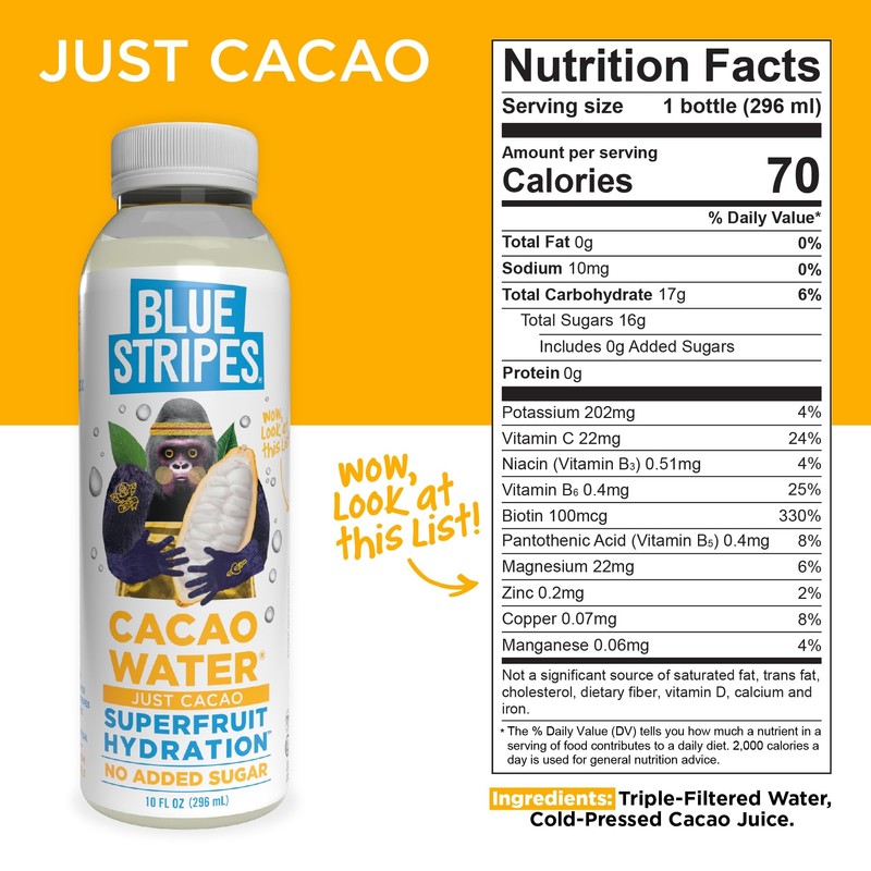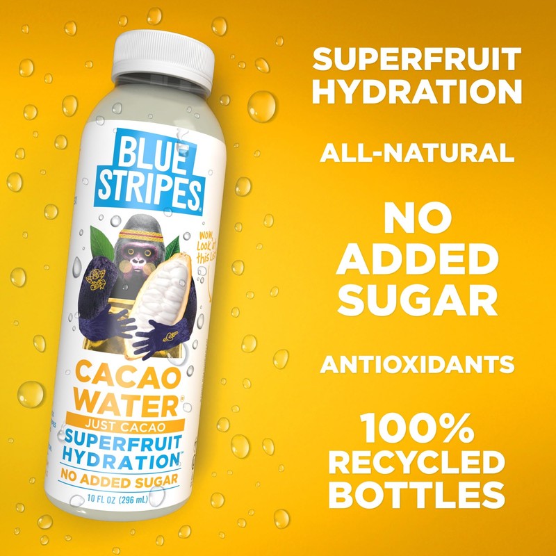 Blue Stripes Cacao Water (Just Cacao) - All-Natural, No Sugar Added, Superfruit Hydration - Electrolytes & Antioxidants | Vitamin C & B | No Artificial Ingredients | (12 Pack)