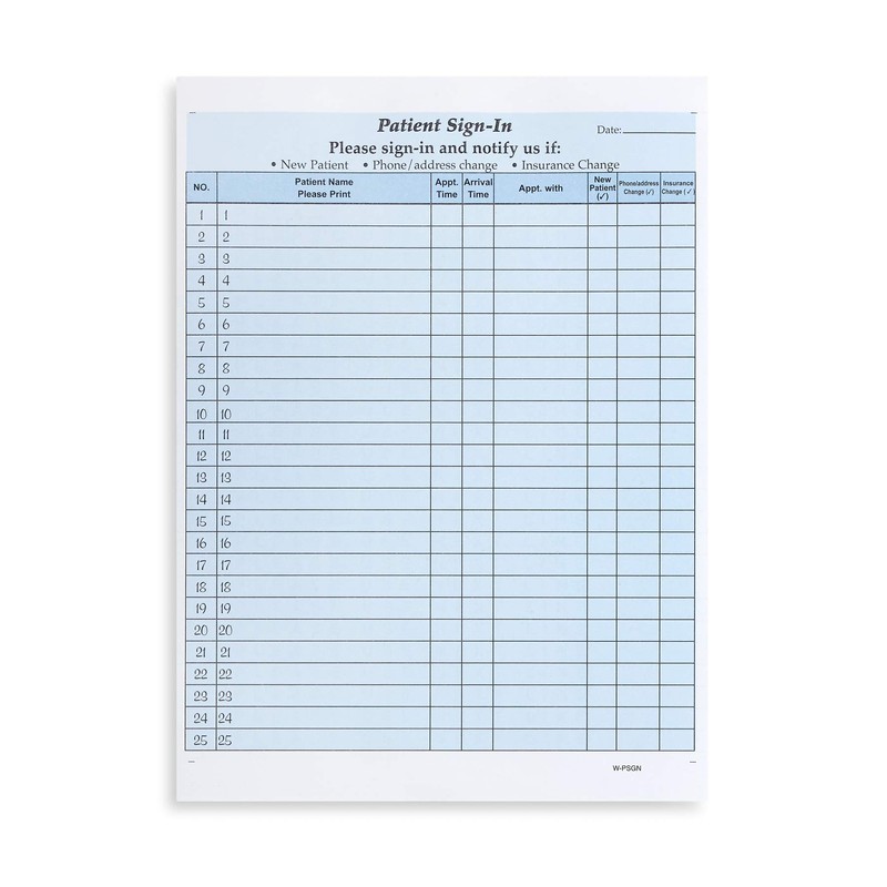 - Save money on your medical office supplies while retaining impeccable day to day records of patient arrivals and updates to their personal information. With 25 lines per sheet in this 25 pack of forms, you can serve up to 625 patient visits using this bulk pack of sign-in sheets