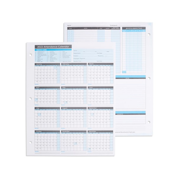 - Our convenient attendance tracker forms are perfect for manager use, HR, warehouse or store location managers. All calendar sheets are printed on two sides of a letter size 8.5” x 11” sheet of high quality card stock and is pre-punched with 3 holes for use in standard 3 ring binders