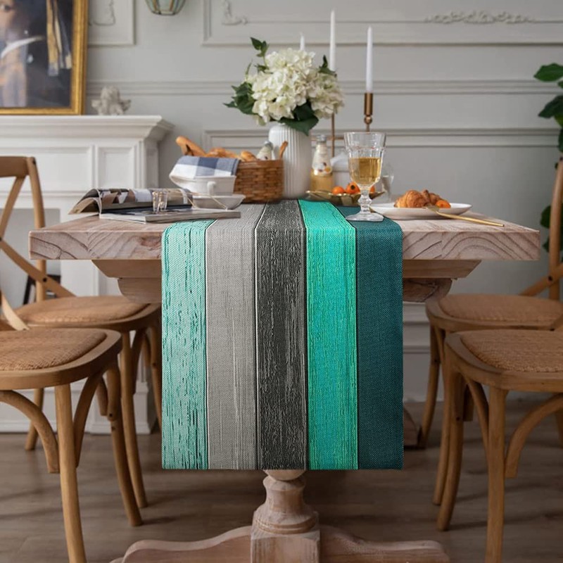 Blue Table Runner Linen Green Table Runner Retro Rustic Barn Wood&Teal Grey Burlap Rectangle Table Setting Decor for Farmhouse Wedding Party Holiday Home Decor Christmas Table Runners 33 X183 cm