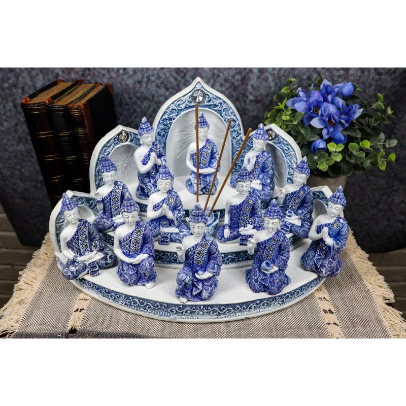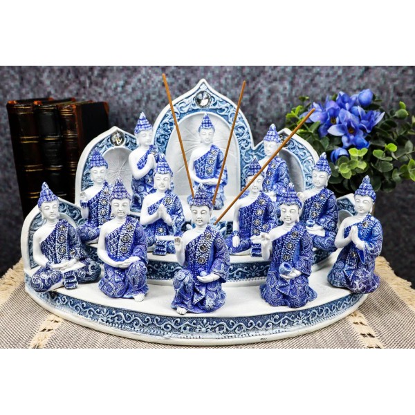 • These Terracotta Blue And White 12 Meditating Buddha Amitabha Miniature figurines with the incense holder display stand set is made of designer composite resin, hand painted and polished individually. Color tone may vary from pictures.