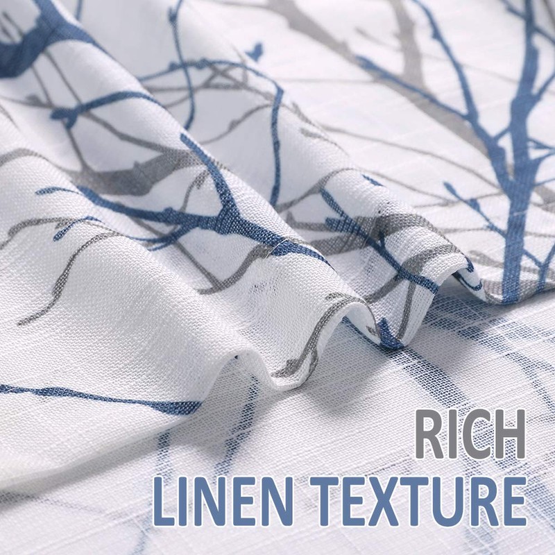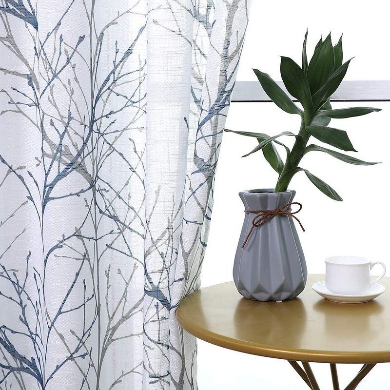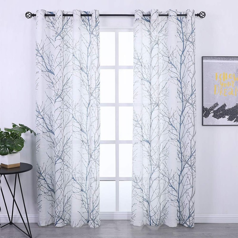 - ''' Premium Quality: Linen Textured Semi-sheer Window Panels#||# READY MADE CURTAINS: Sold in pair, 50 w x 84 /panel, 100 w x 84 /pair, Blue grey branchon white curtains. Recommend ordering 2 to 3 times rod width for proper look and fullness#||# NATURAL INSPIRED PATTERN: Blue and grey tree branch print on white background open weave linen Semi Sheer inspires a modern aesthetic twist with the bold and dramatic natural painting pattern. These print curtains will certainly upgrade your home décor at no cost, perfect for living room, bedroom, family room, dining room, kitchen, farmhouse, studio, Kids Room.#||# DRAPE IN SHAPE: These thick and heavy-duty semi-sheer curtains give the panel a nice drop and a luxurious textured Look. Besides, our curtain is ecofriendly and safe to people with the new print technology.#||# GROMMET TOP CURTAINS: 8 silver grey grommets fit any standard or decorative curtain rods up to 1.5 in diameter. Easy and convenient to hang. These printing window curtains are perfect for living room, bedroom, kitchen, porch, even outdoor place#||# EASY MAINTENANCE: The curtains offer great durability. Machine washable in cold water. Tumble dry low. Quick iron or steam clean at low temperature settings. Feel free to contact us for any product problem, we will certainly respond within 12 hours.'''