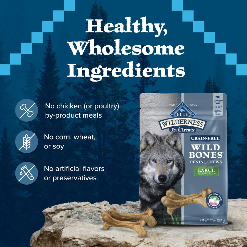 - Contains: One (1) 27-oz bag of BLUE Wilderness Trail Treats Wild Bones Large Dental Chew Dog Treats
