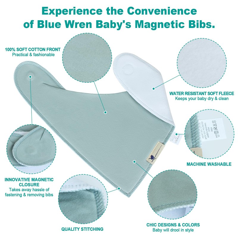 • Elevate your baby's style and simplify your routine with Blue Wren Baby's 5-Pack of Magnetic Closure Bandana Drool Bibs.