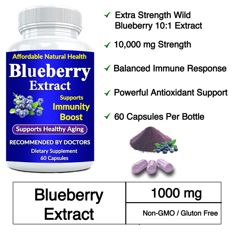 SOURCE OF ANTIOXIDANTS: Wild Blueberries are known for their high antioxidant content, which is important for overall health. Blueberry Extract, an antioxidant supplement and an anthocyanin supplement is also a source of vitamins and minerals including vitamin C, vitamin K and manganese. This supplement is a great addition to any diet for a daily dose of vitamins, minerals and antioxidants. PURE AND AND NATURAL SUPPLEMENT: Our Blueberry Extract is 100% pure and natural with no added ingredients. It is NON-GMO and Gluten free. GOOD VALUE: Our Blueberry Extract contains 10,000 mg strength per capsule and 60 capsules per bottle. Our 1000 mg capsules are extra potent and may offer more effectiveness than other smaller capacity capsules. SAFE PRODUCTION: Our products are manufactured in the USA is a fully compliant facility with adherence to good manufacturing policies with stringent quality control. MONEY BACK GUARANTEE: If you are not satisfied, just contact us for a full refund.